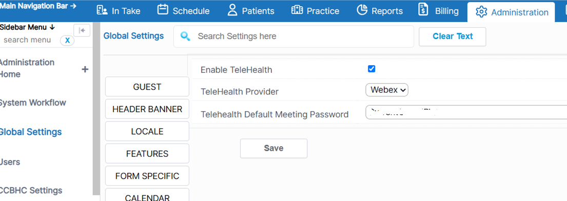 - Go to Global Settings, click the Telehealth tab, and then navigate to the Telehealth Default Meeting Password page.