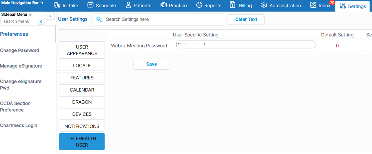 - Go to the Settings tab, click the Telehealth User tab, and then navigate to the Webex Meeting Password page.