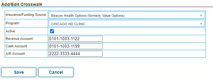 The following image shows the settings defined to create crosswalk entries that include the combination of Insurance and Facility. Account numbers for patients without insurance will include 0000.