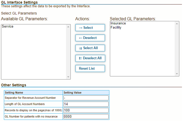 Before you use the General Ledger Interface feature, define the general ledger account number for each facility, insurance provider, and service code for which you want to export data.